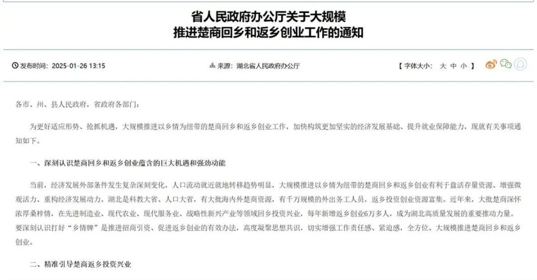 1月26日,湖北省发布《省人民政府办公厅关于大规模推进楚商回乡和返乡创业工作的通知》(下称《通知》)。《通知》提到,近年来该省每年新增返乡创业人员6万余人。