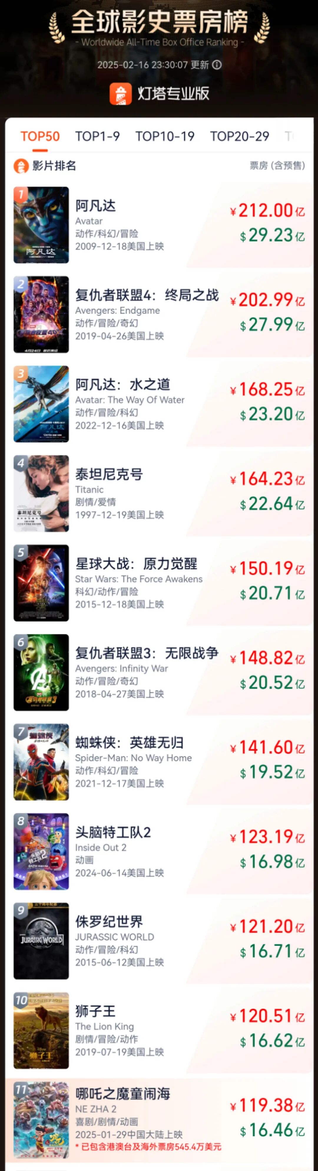 距离全球票房榜前10仅一步之遥