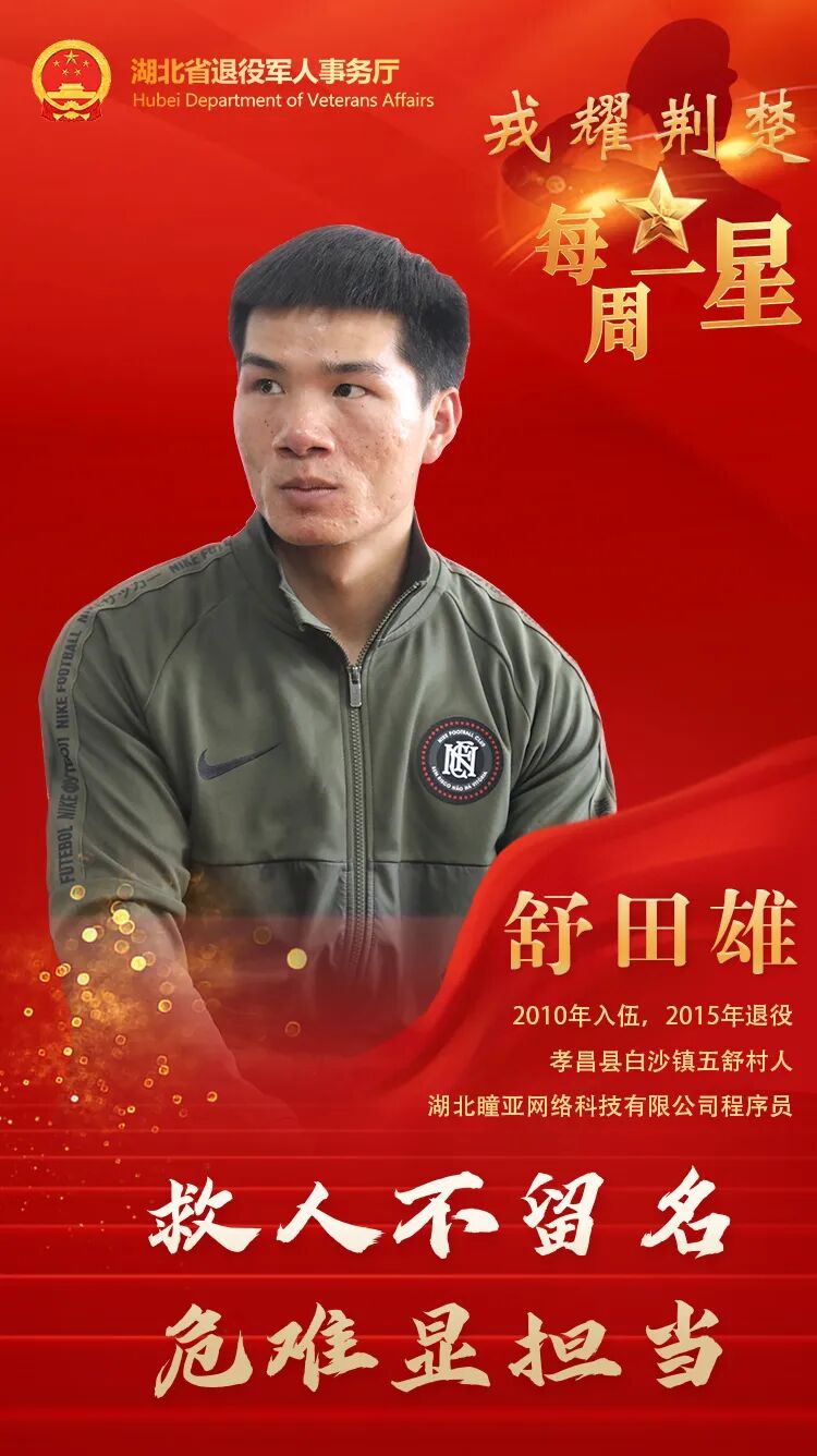 舒田雄出生于1993年10月,孝昌县白沙镇五舒村人,2010年至2015年在天津消防服役。入伍期间,他光荣入党,当了3年班长,多次获嘉奖及“优秀士兵”等荣誉。2022年回到孝感,成为湖北瞳亚网络科技有限公司一名程序员。
