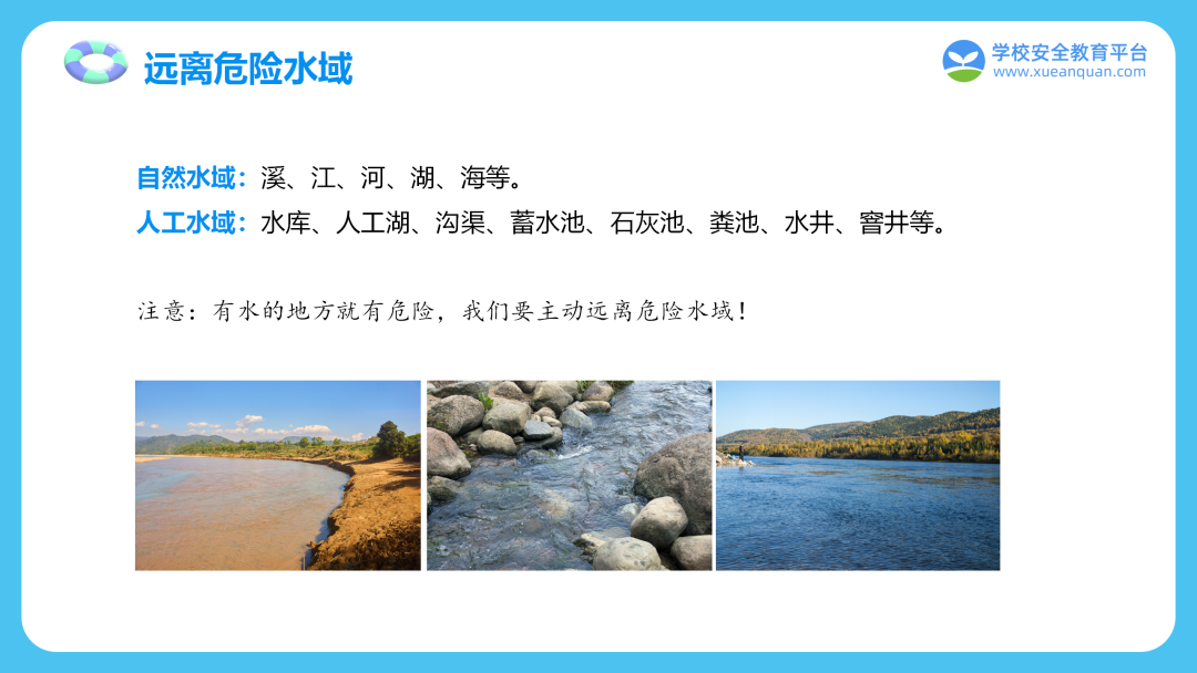 江、河、湖、海等自然水域及水渠、水库、水坑等人工开放性水域存在诸多危险,且遇险难以及时获救。游泳、玩水请在大人陪同下选择正规场所,并使用泳圈、浮板等保护装备。