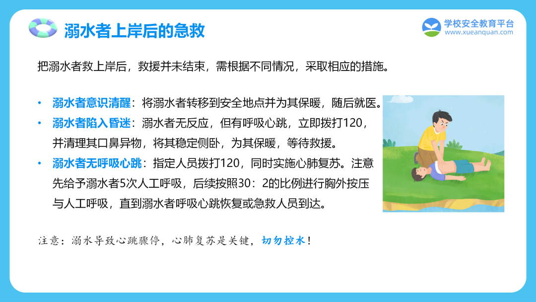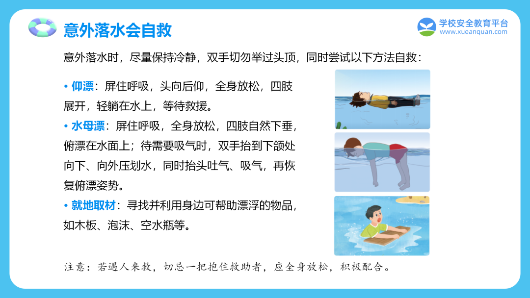 意外落水要保持冷静,放松身体,头向后仰,仰面漂浮待援;发现他人溺水切勿下水施救或手拉手施救,牢记“叫(大声呼救)—叫(拨打110、120)—伸(竹竿、树枝)—抛(救生圈等漂浮物)”。