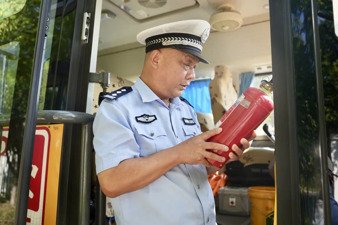 “校车安全关系到每一个学生的生命安全,必须逐一检查,不能有任何疏漏。” 开学前一天,黄超就带领民警来到孝昌县清溪实验学校,对学校的校车进行全面检查。他先是绕着校车仔细查看车身外观,检查车辆的轮胎、刹车、灯光等部件是否正常;然后检查车内的灭火器、应急锤等安全设备是否齐全有效;最后还查看了校车的行驶记录、驾驶员的资质证明等相关资料。