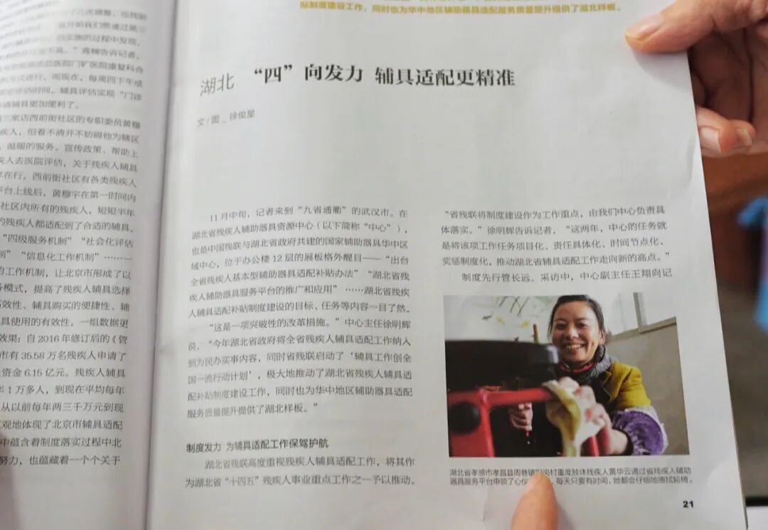 邹岗镇阳岗村村民黄华云患有肢体残疾,由于市面上的轮椅尺寸不合适,给她的生活和出行造成了诸多不便。孝昌县残联了解情况后,主动上门为她量身定制了小尺寸轮椅,让她出行更加方便。孝昌县辅助器具适配工作的经验,在中国残联会刊《中国残疾人》杂志上得到总结与推广。残疾人黄华云荣登该期会刊封面,成为全国辅助器具适配精准服务的典型范例。