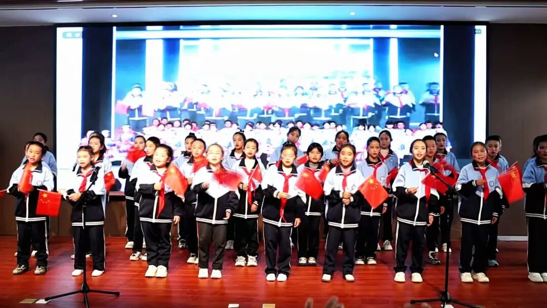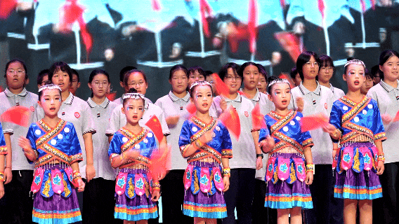 演播厅内,红旗飘扬,节日氛围浓厚。湖北孝昌与新疆温泉的演员和观众通过云端技术实现实时互动,共同演绎了一场精彩纷呈的文化盛宴。两地学生与读者共同演唱《我爱你中国》,稚嫩却坚定的童声、饱含深情的演唱,不仅唱出了对祖国母亲的无限热爱,更展现出新时代各族人民昂扬向上、奋发有为的精神风貌。
