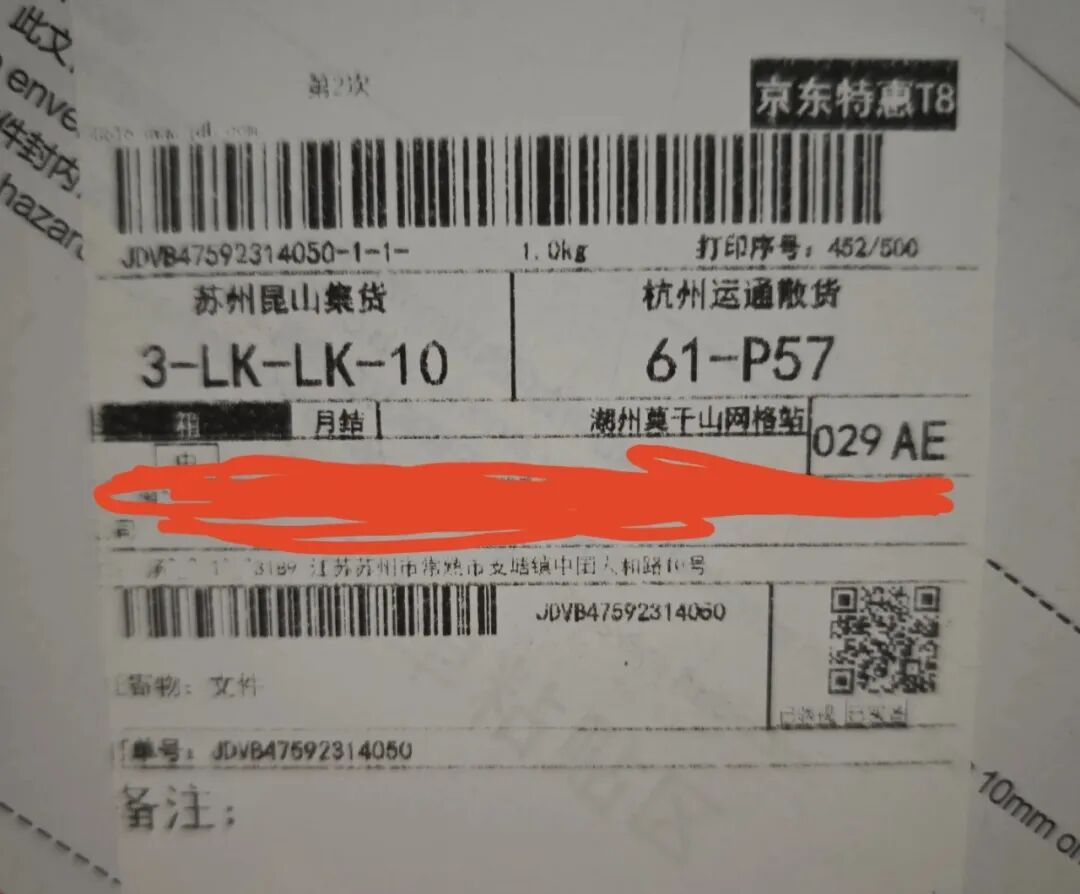 图为周女士收到的蟹卡快递面单。(受访者供图)