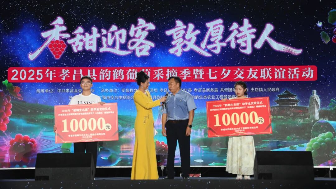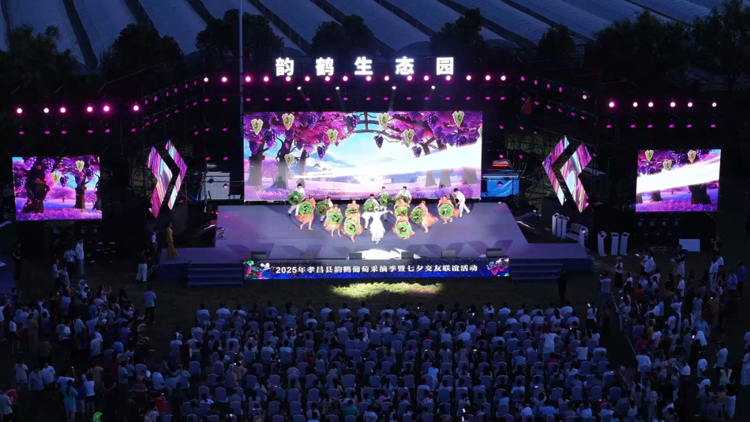 今年8月28日,韵鹤葡萄采摘节如约而至。夜幕降临时,电音派对把气氛推向高潮。葡萄藤上缠着的彩灯全亮起来,省歌舞团的演员在临时舞台上跳起改编的采茶舞。