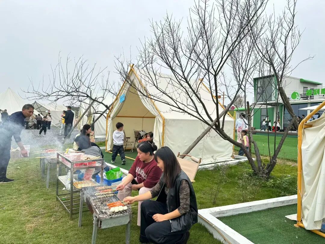 拔河比赛结束后,大家陆续走向各自的露营区。不少家庭提前备齐装备——帐篷里铺好了野餐垫,摆满水果、点心和饮品;帐篷外,家长正兴致勃勃地用便携炉具烤肉。大人和孩子围坐在一起,分享美食,畅谈笑语,沉浸在这段难得的惬意时光中。