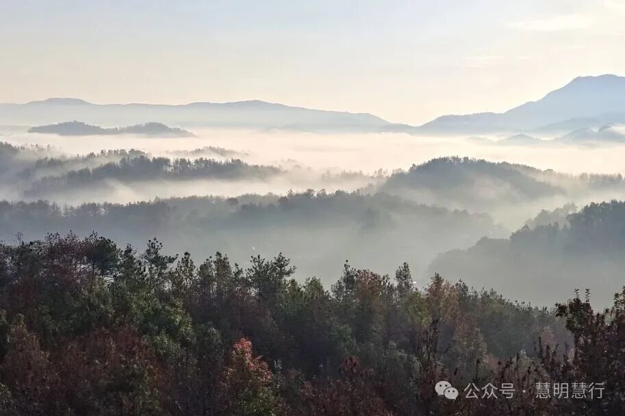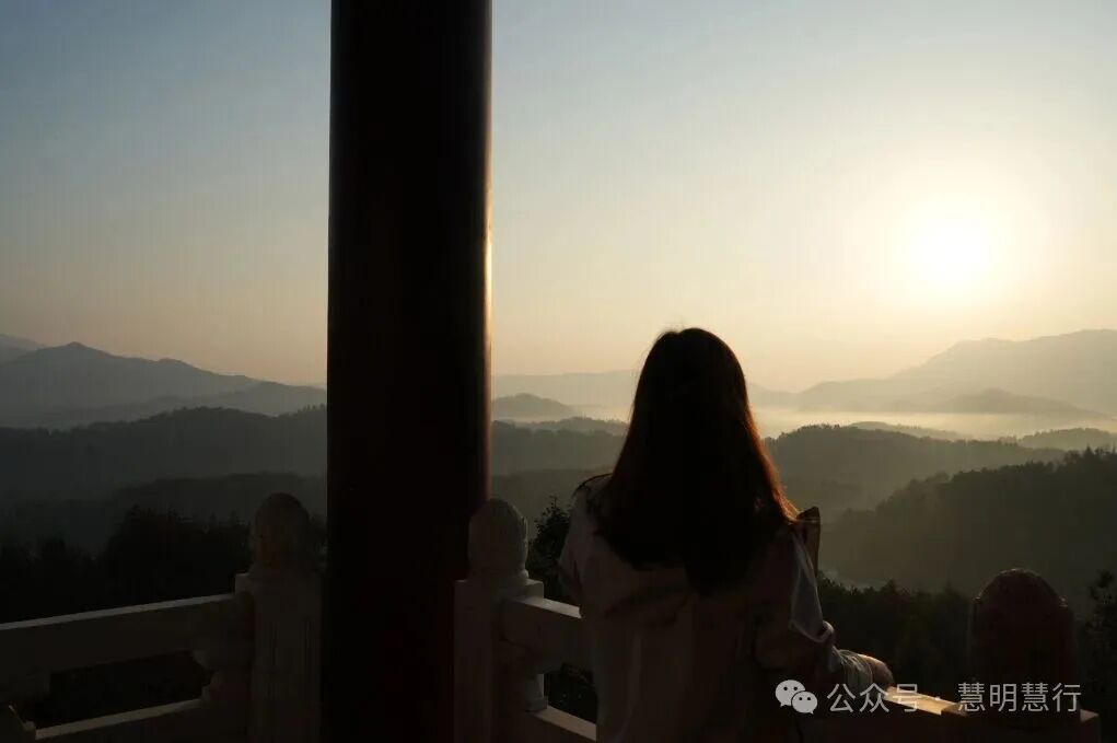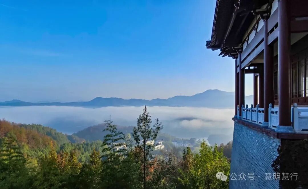 沿石阶缓步而上,远处云海翻涌,脚下落叶轻响,身边秋色环绕,耳畔鸟鸣清脆,连呼吸都带着山间的清甜。不知不觉间,便已抵达观景台。