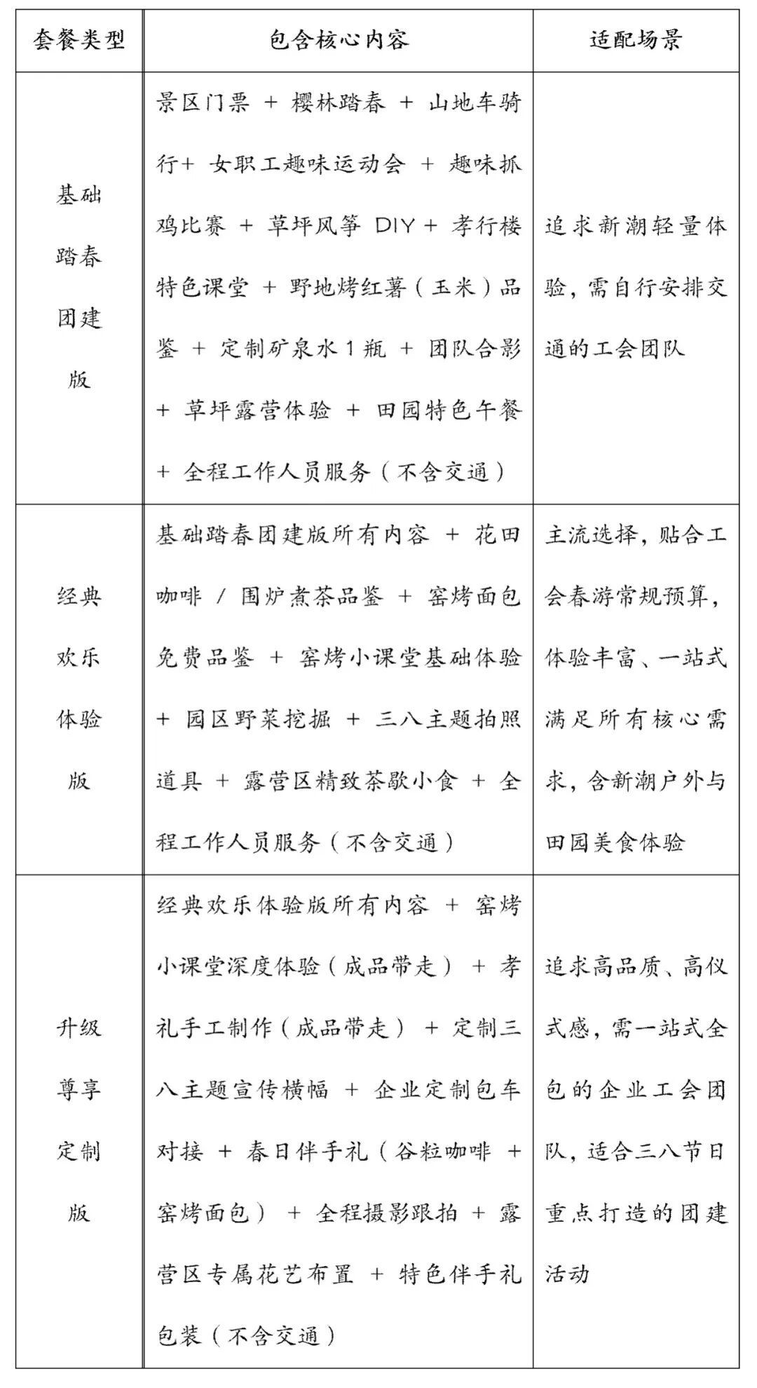 3.所有套餐的体验项目可按需互换(如孝行楼课堂可与野菜挖掘调整顺序,山地车骑行可根据需求调整时长),景区免费提供定制化流程调整,不额外收费;