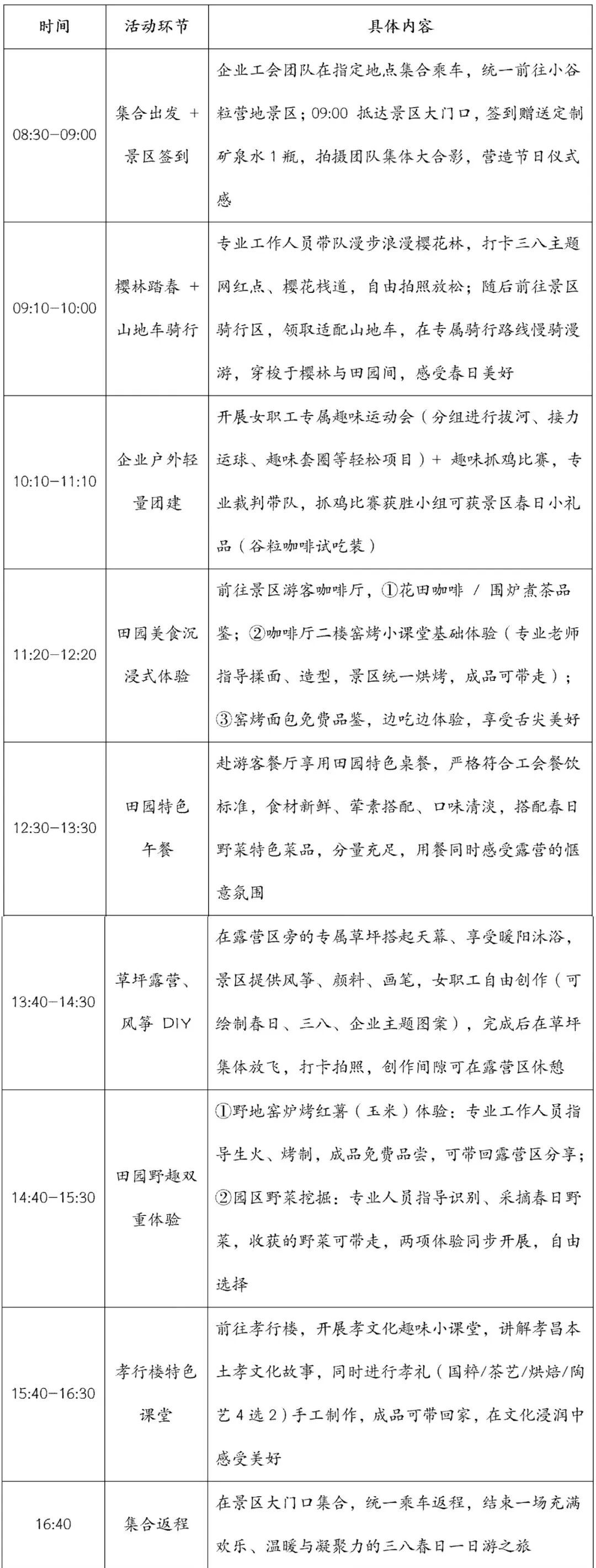 本方案可根据企事业单位女职工工会的实际预算、人数、体验需求进行全流程定制化调整,小谷粒营地景区将以专业的服务、丰富的体验、贴心的保障,为每一位女职工打造一场难忘的三八春日一日游之旅,让巾帼芳华在樱谷的春风中尽情绽放!