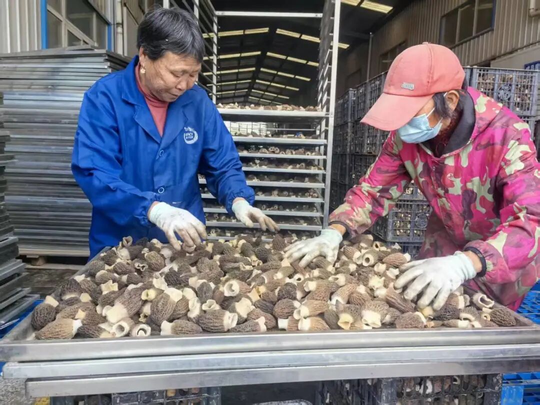 工人们分拣羊肚菌后,摆盘等待烘干。(通讯员 陈峥嵘 摄)