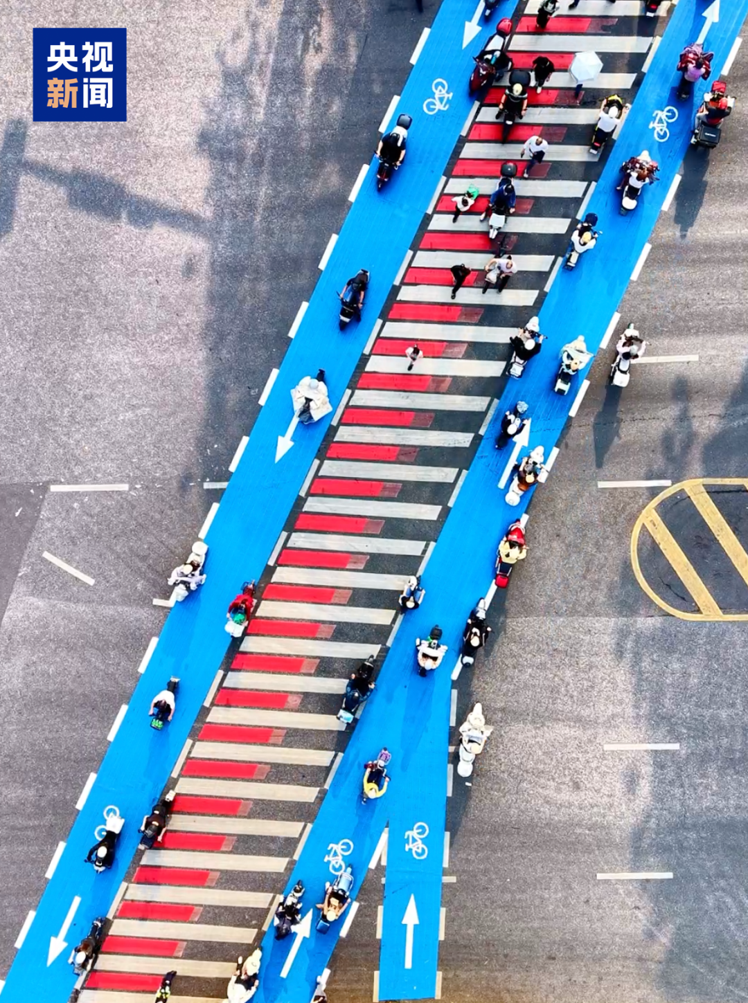 增设“蓝道过街”专用通道,实现路权归位。在斑马线两侧专门施划浅蓝色非机动车骑行专用通道,用标线将行人与非机动车分开,实行“人走中间、车走两侧”的通行模式。
