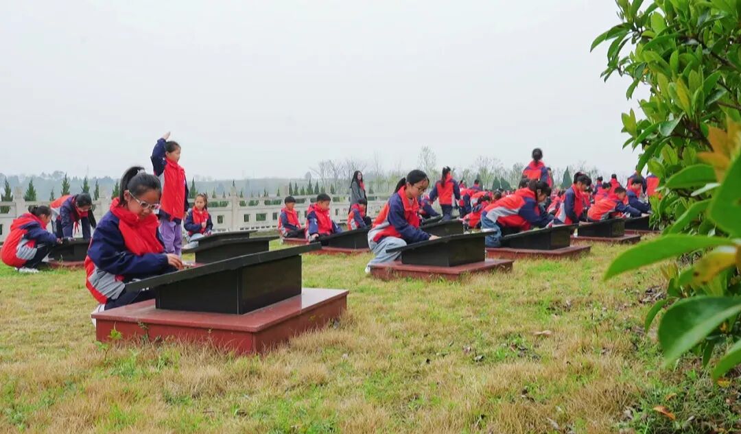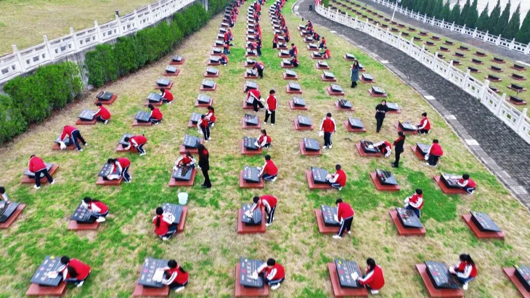 墓碑前学生们目光虔诚,紧紧注视着镌刻着烈士姓名与事迹的墓碑,他们手持干净的抹布,轻轻拂去碑身的尘土,以庄严简朴的方式表达对烈士的敬仰与追思。
