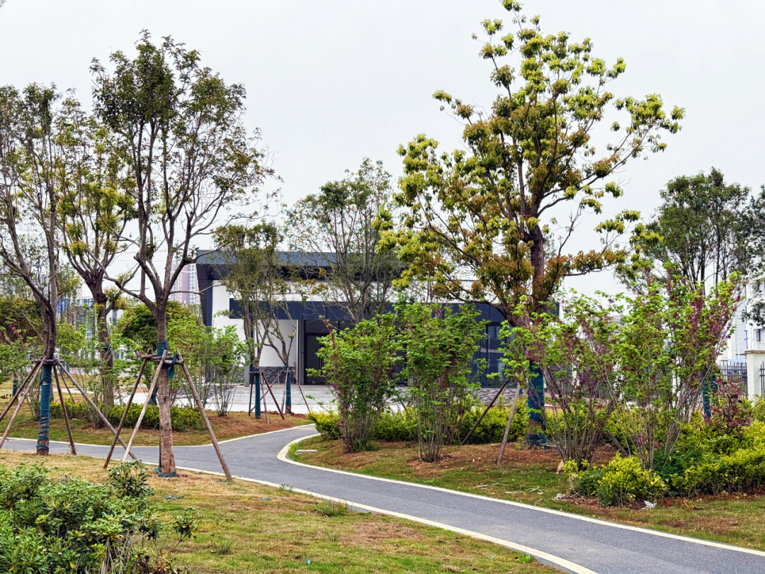 走进公园,蜿蜒曲折的慢行步道穿梭在错落有致的绿植间,步道两侧草木葱茏、花卉点缀,园内还同步建设雨水调蓄设施,实现生态与观赏兼具,营造出雅致宜居的休憩氛围。