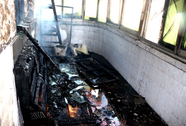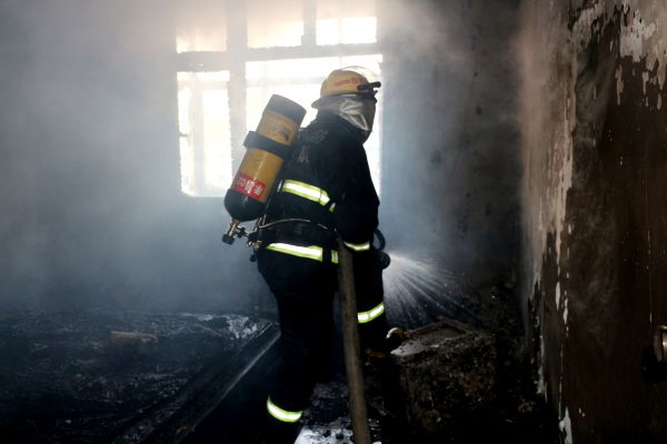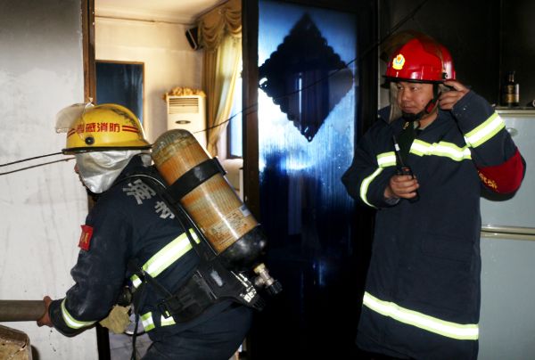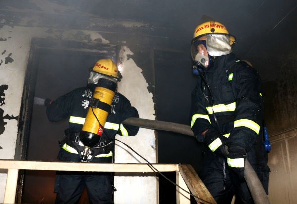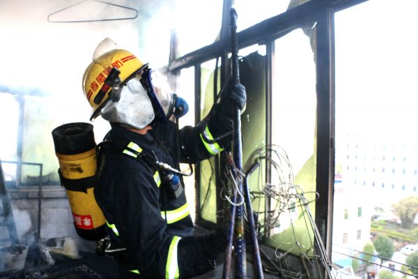 指挥员立即让战士们出一支水枪,从复式楼西边一间的北房门进入,用水枪扑灭南房门的明火后,再进入阳台,砸碎南阳台的玻璃排烟,并将阳台上正熊熊燃烧的沙发上的明火扑灭。随后战士们调转枪头。从复式楼东边一间的北房门进入,朝房间正在燃烧的衣柜、床铺和电脑桌等扫射,并砸开房间南边的窗户玻璃排烟。