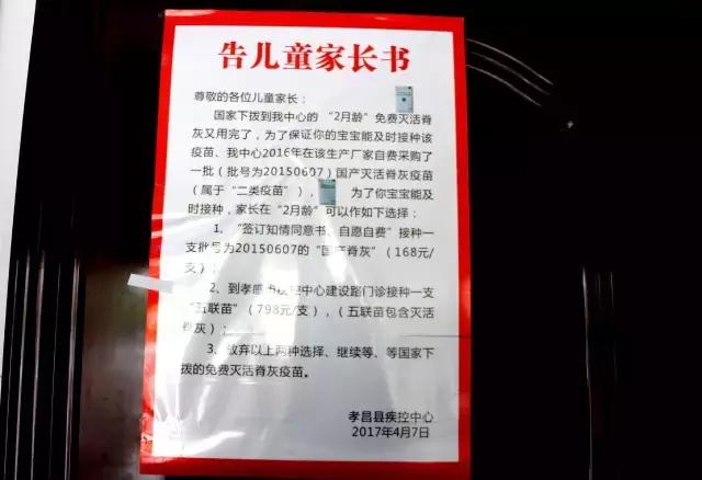 通告称,国家下发到我中心的“2月龄”免费脊灰疫苗又用完了,我中心2016年在该生产厂家自费采购了一批(批号为20150607)国产脊灰灭活疫苗,(属于”二类”疫苗),家长可选择“签订知情同意书、自愿自费”接种168元的国产疫苗;或接种798元的“五联苗”;或放弃以上两种选择继续等。