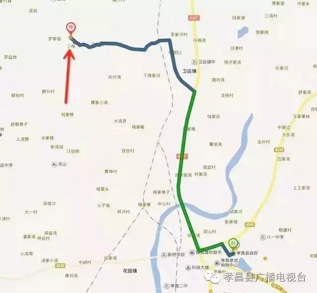路线一:孝昌城区——卫店镇——三三八——铁路小涵洞——久隆街——三杨村二杨湾——蓝莓园
