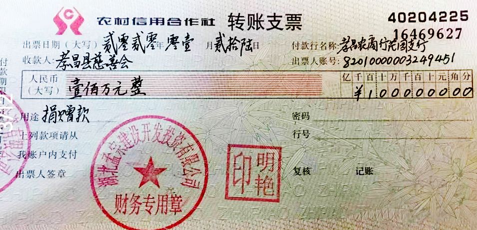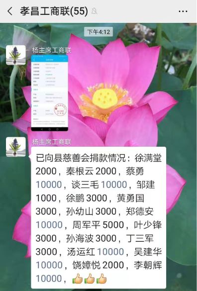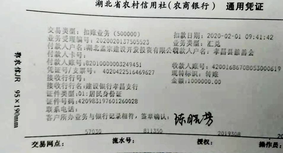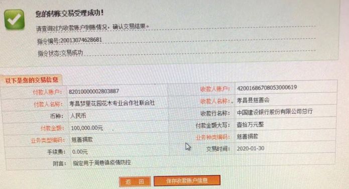 1月30日,孝昌梦里花园花木专业合作社联合社捐赠10万元用于周巷镇疫情防控。