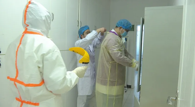 在县第一人民医院感染科隔离病区,记者在医务人员的引导下,穿上了厚厚的隔离服、鞋套,戴上手套、口罩,从清洁区、缓冲区到半污染区,经过封闭的门,再往里走,进入到隔离区病房。