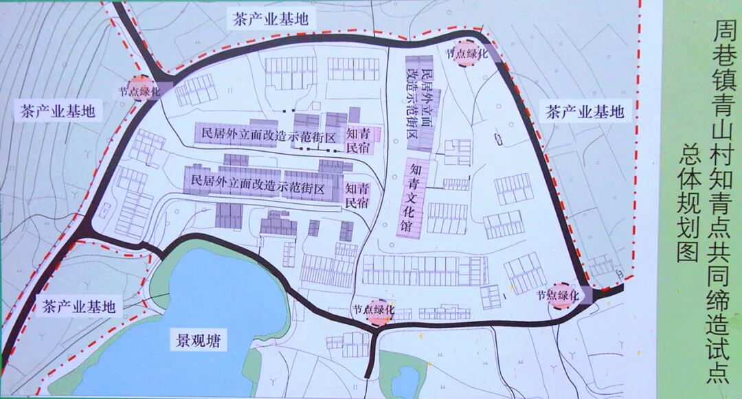 随后,青山村请来了设计、测量专家,在充分听取村民意见建议的前提下,绘就青山村发展蓝图。将知青文化、孟宗文化、茶文化与旅游资源融合,形成“一心一环四个示范点”的规划空间布局,建设知青民宿、知青农场、知青文化馆、幸福食堂、景观塘,孟宗文化馆、孟宗竹园、青山口漕渡景观长廊、生态茶园、茶艺温泉民宿等。随即,试点村建设工程正式启动。