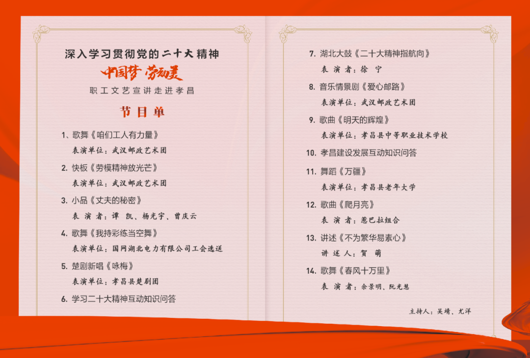 闭幕式结束后,还将举行湖北省总工会深入学习贯彻党的二十大精神“中国梦·劳动美”职工文艺宣讲走进孝昌活动。