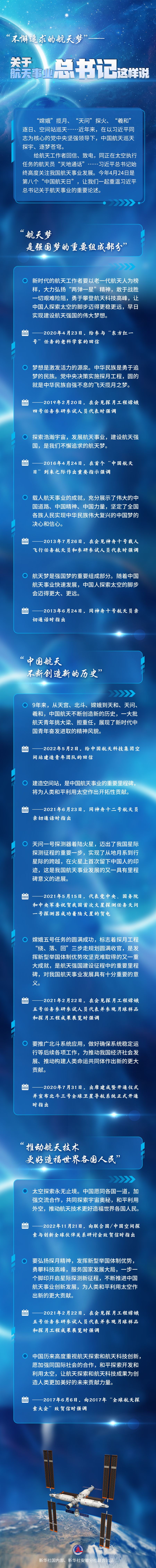 给航天工作者回信、致电,同正在太空执行任务的航天员“天地通话”……习近平总书记始终高度关注我国航天事业发展。今年4月24日是第八个“中国航天日”,让我们一起重温习近平总书记关于航天事业的重要论述。